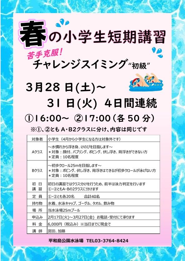 NEW2026【春の小学生短期講習】「苦手克服!チャレンジスイミング”初級”」