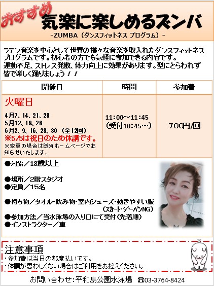 ※2Fスタジオで開催。予約不要、開始時間前までに当水泳場受付までお越しください。お問合せ03-3764-8424