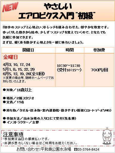 ◇NEW「やさしいエアロビクス”初級”」毎週金曜日10:30~(60分)