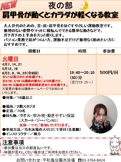 ◇NEW「肩甲骨が動くとカラダが軽くなる教室」毎週火曜日19:40~(30分)